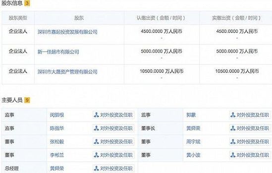 工商资料显示,深圳市大晟新一佳商业运营管理有限公司于2016年9月20日成立,注册资本1000万元,由深圳市大晟资产管理有限公司控股(52.5%股比),新一佳超市有限公司占比25%。
