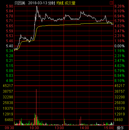 3月13日10点30分,贝因美股价直线拉升,成交量明显放大,一度触摸涨停。截止收盘,贝因美报5.67元/股,涨幅达5%。当日成交量42.9万手,成交额达2.44亿,较之前明显放大。